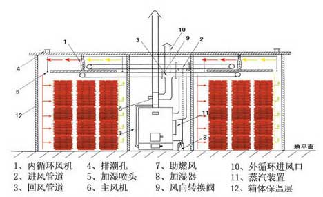 1.設(shè)備上配有蒸汽發(fā)生裝置(可產(chǎn)生大量的常壓蒸汽)、助氧風(fēng)閥、回風(fēng)閥、排潮系統(tǒng)等。二、RZH型磚混木材烘干機原理: